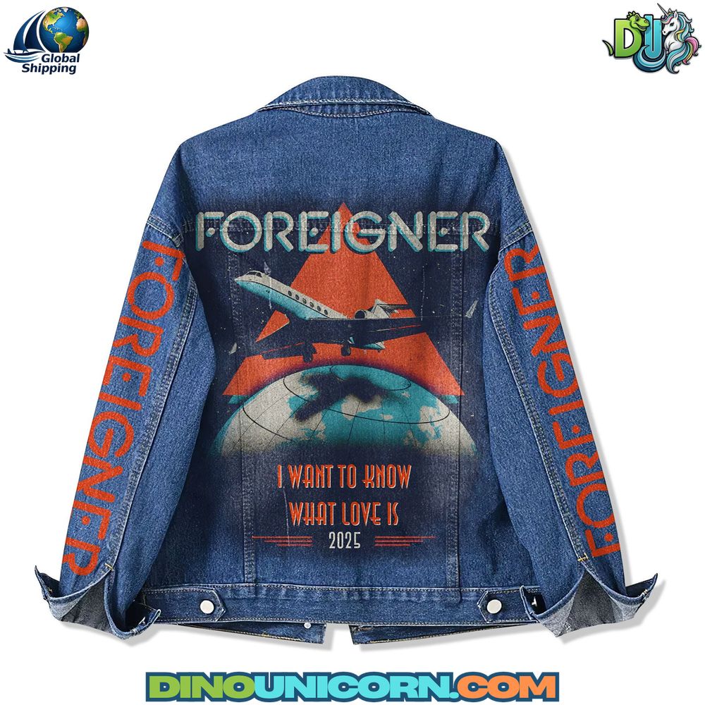 The Foreigner denim jacket is more than outerwear — it’s a piece of rock history. Inspired by the legendary band Foreigner and their iconic anthem “I Want To Know What Love Is,” this Foreigner jean jacket captures the soul of 80s rock and the style of modern streetwear. With its bold artwork featuring a jet over a world map and tour-inspired typography, this jacket pays homage to decades of unforgettable music and emotion.