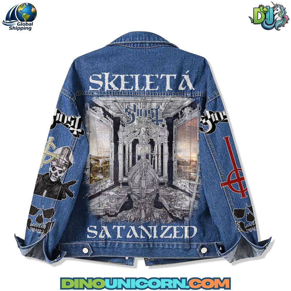 Constructed from premium breathable cotton denim, this Ghost band jean jacket combines durability with expressive artistry. The back panel showcases a gothic cathedral-inspired illustration with skeletal motifs and architectural grandeur, crowned by the Ghost insignia and the striking inscription “SKELETA SATANIZED.”