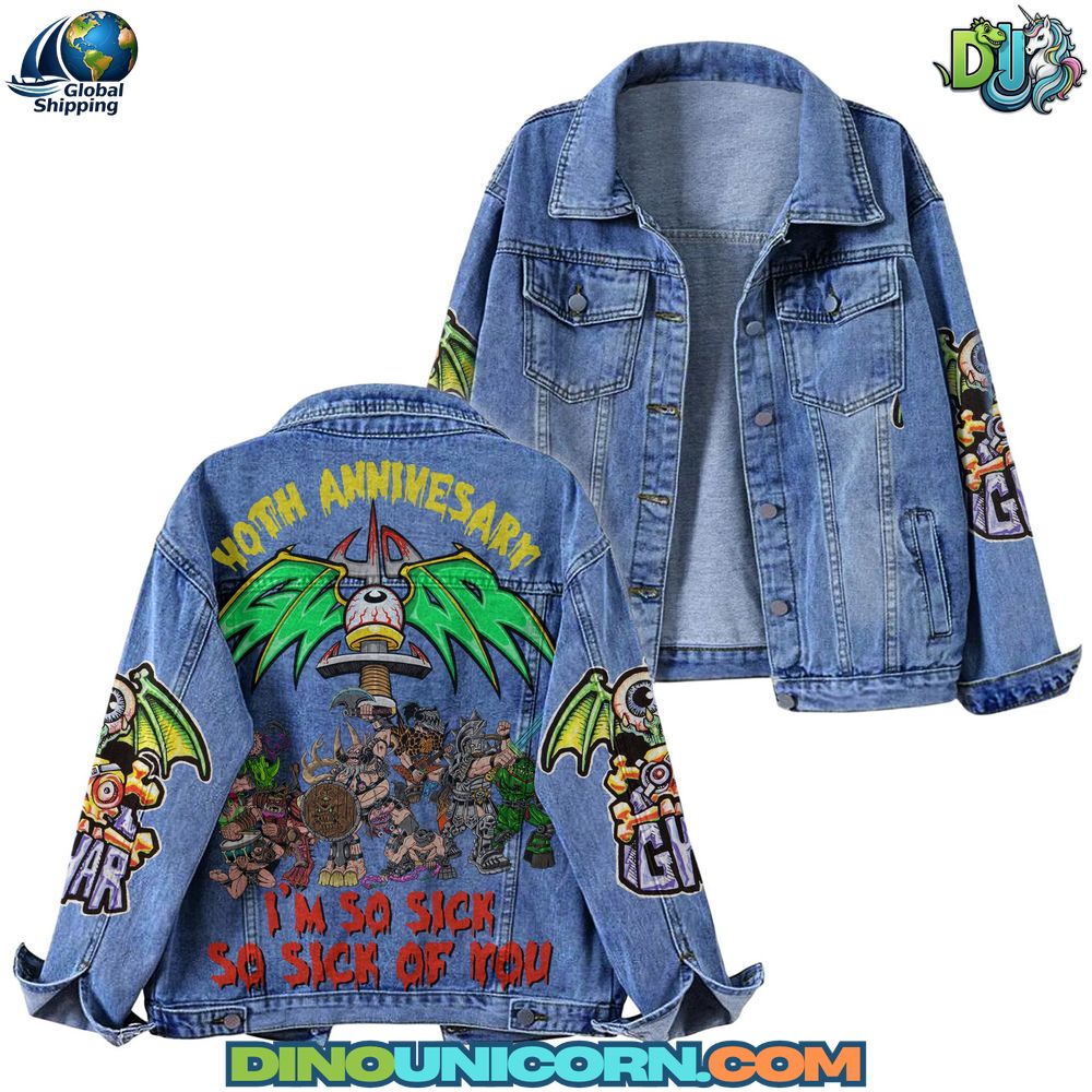 This GWAR band denim jacket is more than apparel; it’s a full-scale tribute to the band’s grotesque genius. The back features a vivid embroidered graphic of GWAR’s legendary characters, set against the triumphant “40th Anniversary” banner and the line “I’m so sick, so sick of you” — a lyric that every fan knows by heart. The bold sleeve designs, featuring GWAR’s signature monsters and green bat wings, transform this jacket into a walking concert poster. Every detail — from the rugged stitching to the high-definition artwork — reflects the spirit of rebellion that defines GWAR.