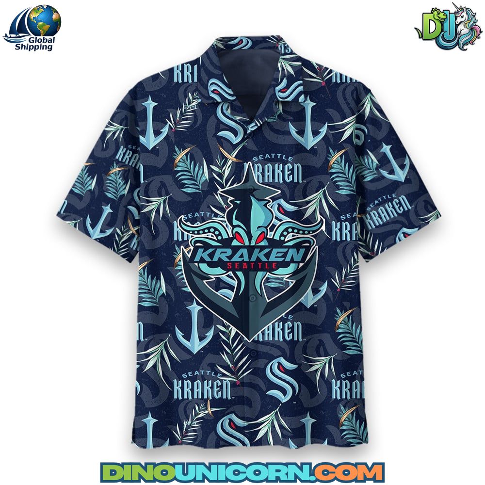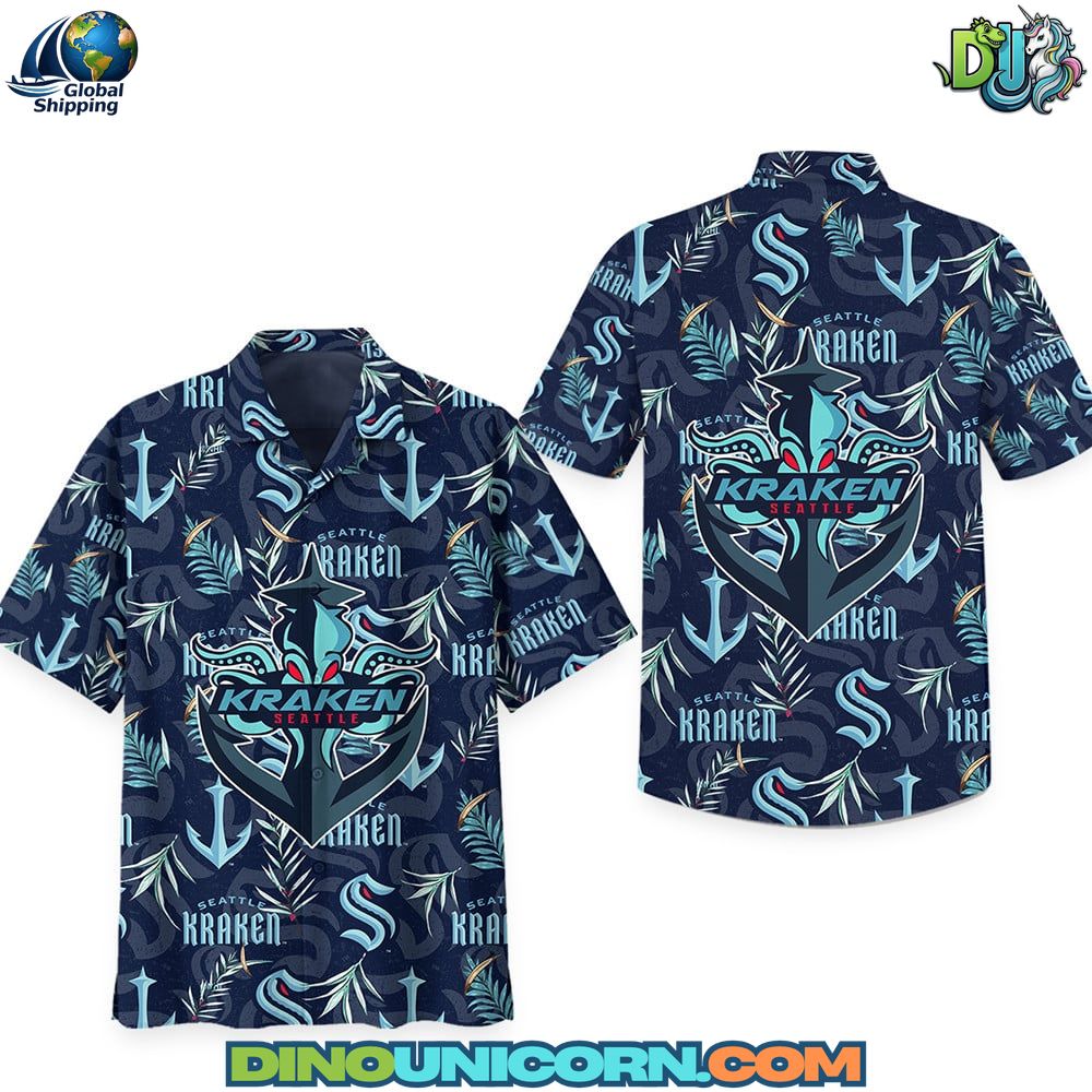 Crafted from premium lightweight fabric, this shirt features a navy-blue base adorned with anchors, palm leaves, and tentacle patterns, reflecting the team’s maritime identity. The front and back showcase the Seattle Kraken crest in full detail, surrounded by sea-inspired graphics that echo the depths of the Pacific Northwest. Each shirt is custom printed using eco-friendly dyes, ensuring long-lasting vibrancy without compromising breathability. The relaxed fit, soft texture, and short-sleeve button-up style make it a perfect all-season tropical wear piece for fans of all ages.